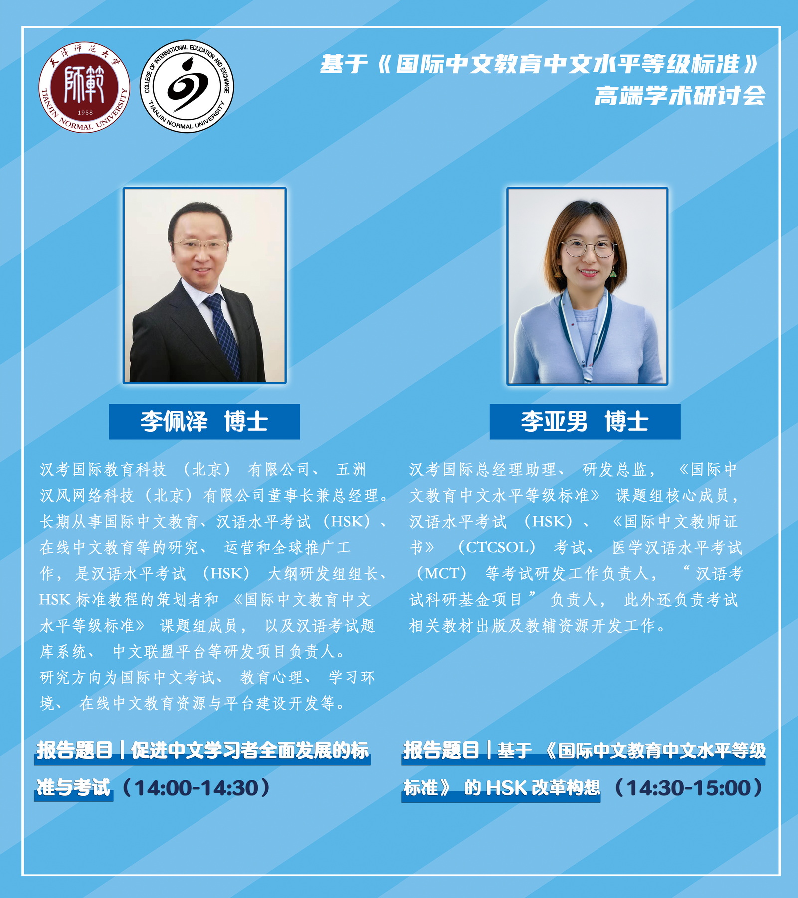 首先,汉考国际教育科技有限公司、五洲汉风网络科技有限公司董事长兼总经理李佩泽博士作了题为《促进中文学习者全面发展的标准与考试》的报告,李佩泽讨论了我国古代和近代汉语教育史对汉语二语教学的启示,并对国际中文教育70年标准和考试的沿革进行了反思,向大家介绍了国际中文教育标准体系建设与中文考试改革的路径和框架。汉考国际总经理助理、研发总监李亚男博士作了题为《基于<国际中文教育中文水平等级标准>的HSK改革构想》的报告,她不仅介绍了HSK的考察内容、考试设计、题型设计等内容,也提出了未来HSK考试的改革发展方向。两位专家分别从宏观和微观两个视角对《等级标准》在HSK考试中的语言交际能力和理解能力等领域的应用进行了解读,既为我们科学研究拓展了思路,也为我们的教学指明了方向,更为我们有效提高汉语学习者的中文水平等级提供了理论支撑。