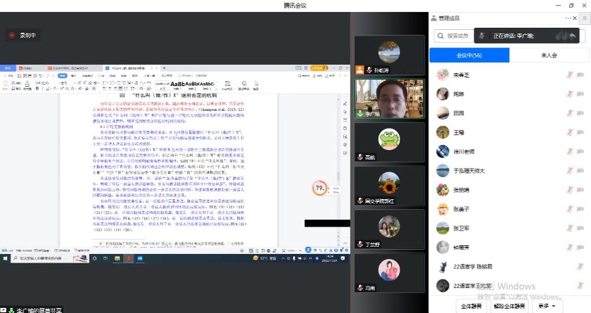 专题报告结束后,与会师生给予了很高的评价。陈晨老师认为该报告内容深刻、逻辑清晰,体现出严谨的治学态度;郭红老师认为该报告有理有据、清楚实用,具有较强的科研示范性;董月凯老师认为报告很精彩,具有很大的启发意义。陈晨老师在总结发言中指出,李广瑜老师在报告中提到与员工共同开展语言研究,这给公司的师生带来重要启发。我们公司的老师在进行科研活动时也可以带动员工开展高质量研究,教学相长,以促进师生科研水平的共同提升。