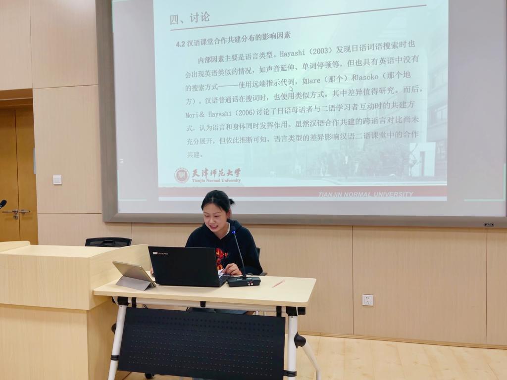 张博羽、温怡然等七名同学重点汇报了案例研究在国际中文教育中的应用、反思等方面,具体讲解了案例教学法的相关理论知识及案例学习的具体过程,介绍了案例库的建设情况。刘璐、张雯则对具体案例展开分析,从实践应用的视角进行了更加具体的分享,为同学们后续的国际中文教育课堂教学设计提供了很多实用性指导。