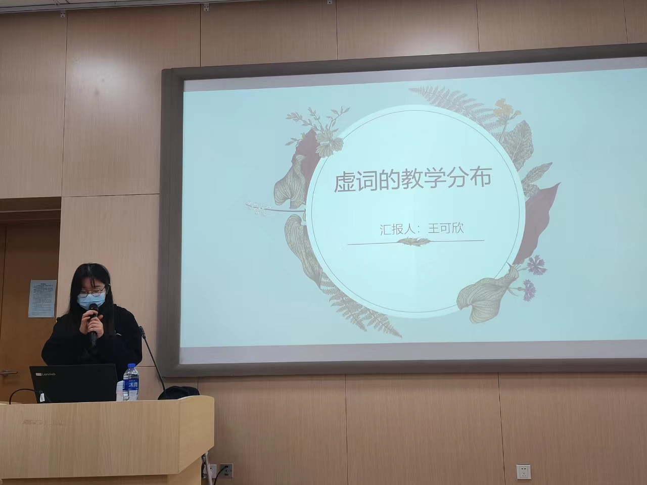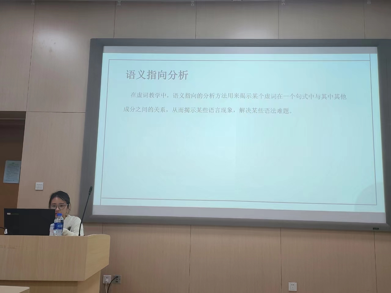 王可欣同学介绍了汉语虚词的教学分布,并以“不/没”为例,介绍了相近、相关副词的比较方法;刘思莹、陈菲菲以语序为切入点,分别介绍了副词、介词及其短语在句中的位置,举例说明了副词、介词及其短语在句中的位置不同,表达的意义和作用不同;罗艺清从学习者偏误入手,通过例句介绍了学习者习得汉语虚词时常见的成分残缺、混用和错用偏误,还介绍了虚词对谓语及其连带成分的语义和色彩的要求;何林萤从虚词的语法意义、逻辑语义背景和语义特征三个方面阐释了虚词语义教学的要点,以副词“也”的教学为例,强调虚词教学应突出其语法意义和语用意义,走出教学中重形式轻语用的误区;杜氏云英以“被”字句和“把”字句的教学为例,介绍了语义指向分析法在汉语虚词教学中的应用,阐释了语义指向分析的定义、方法原则和注意事项;阮氏秋芳简要介绍了比较分析法在虚词教学中的应用,她以副词“少”为例,讲述了比较分析法在虚词教学的引入阶段、展示阶段、操练阶段和归纳阶段操作方法,并指出了比较分析法在虚词教学中的不足之处;杜氏兰介绍了虚词在使用时所体现的主观评价意义,认为部分副词含有对客观情况的主观评价意义,集中反映在副词所示的数量意义和句子语气中。