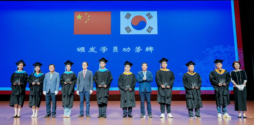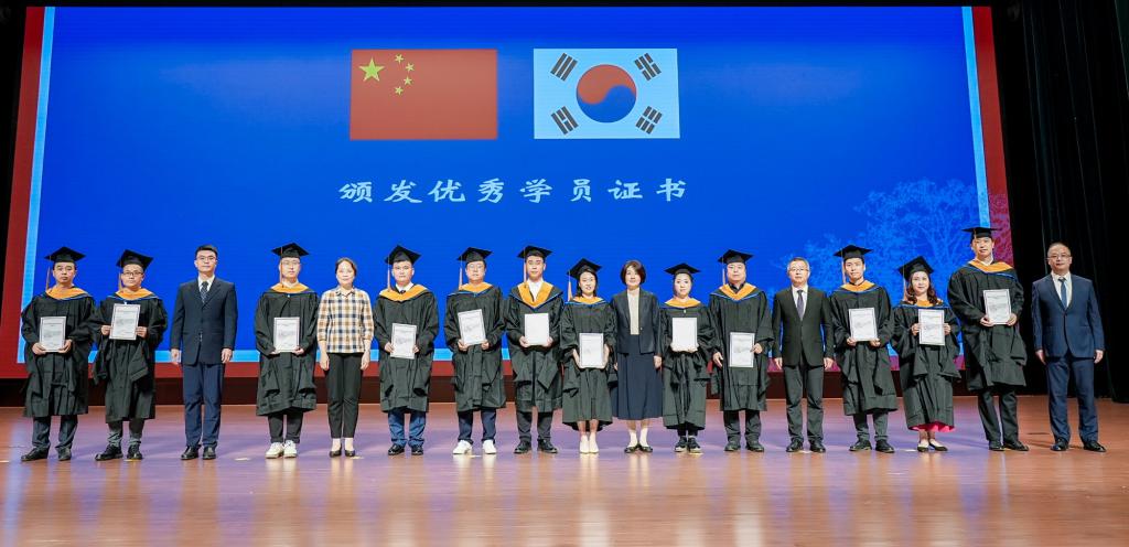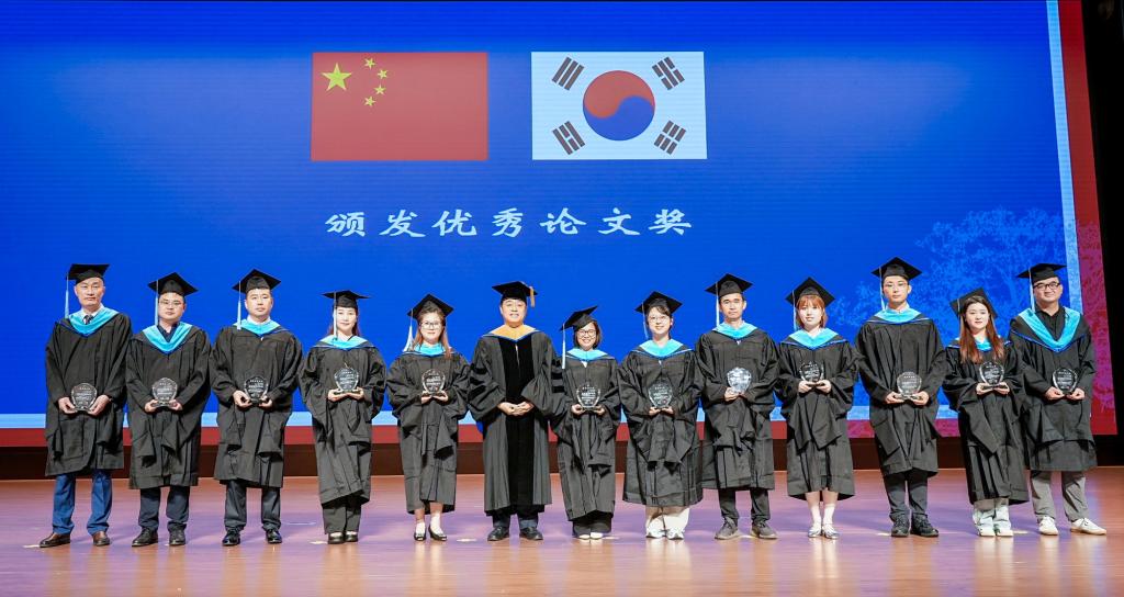 杨薇作本届中韩合作办学项目硕士公司产品过程报告。中韩双方相关部门负责人向双方教学和管理人员、优秀学员等颁发优秀论文证书和优秀学员证书。