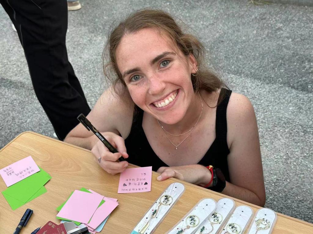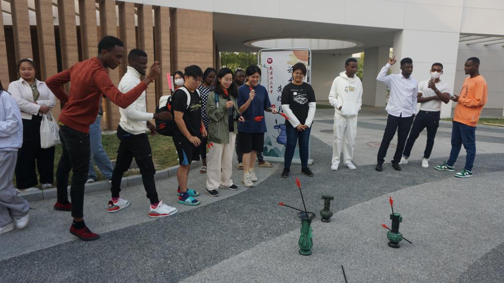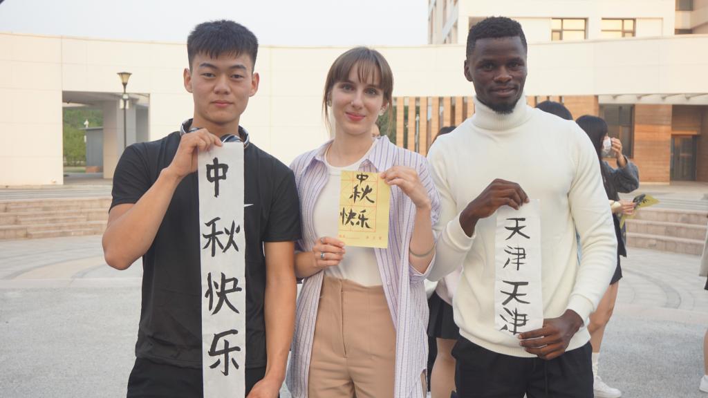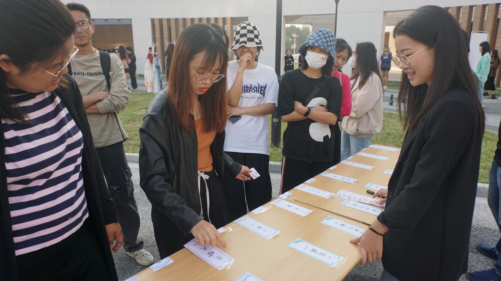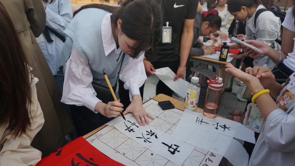 投壶是从先秦延续至清末的中国传统礼仪和宴饮游戏,来源于“六艺”之一的射礼。在投壶体验活动的现场,同学们使出浑身解数争相比试,热闹非凡。活动现场,写满中秋诗词的书法作品为活动增添了不少节日氛围,也吸引中外员工驻足,亲自上阵,在中国员工的指导下纷纷拿起毛笔书写着节日祝福。为增加中秋活动的趣味性,现场为中外员工精心准备了不同难度的灯谜。无论是中国同学还是职工同学,都站在灯谜前聚精会神凝心思考,想要用尽所学的知识将它们一一击破。