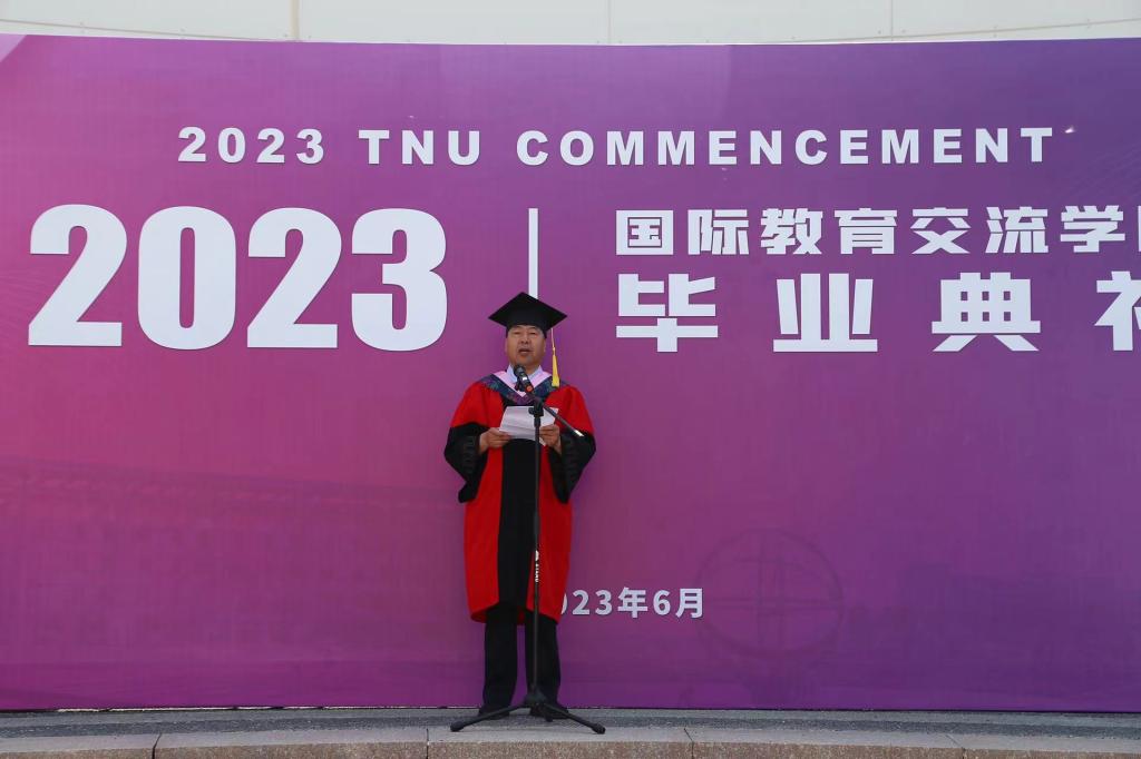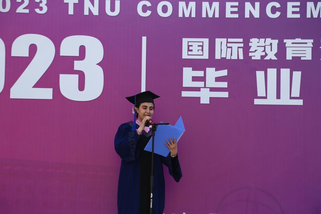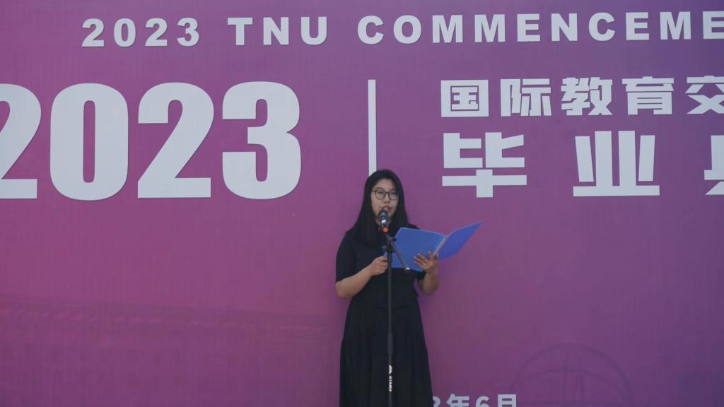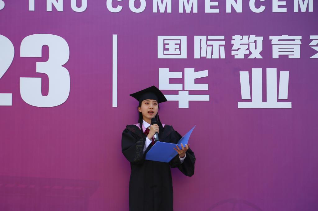 本科生陈嘉怡、国际员工周华荣和在读研究生于依萱分别作为中国员工毕业生代表、国际员工毕业生代表和在校生代表发言。