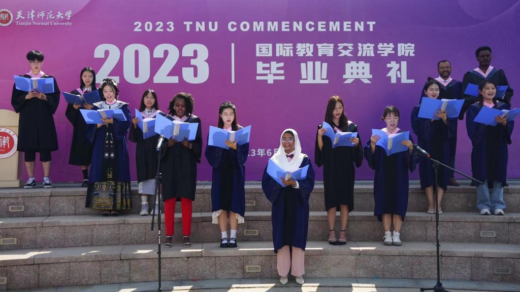 由13名中外毕业生代表倾情演绎的诗朗诵《我爱师大,我爱国交》将毕业典礼推向了高潮。同学们饱含深情,纪念在师大求学的美好岁月,把对母校的深厚情感、老师的辛勤付出和对未来的美好祝愿汇入诗歌中,汇流至同学们心间。