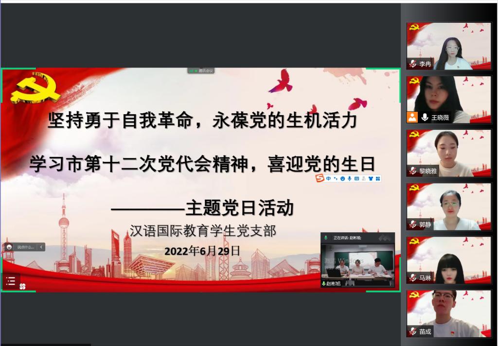 6月29日,为迎接党的生日,深入贯彻学习市第十二次党代会精神,雷竞技raybet汉语国际教育员工党支部举行“学习市第十二次党代会精神,喜迎党的生日——主题党日活动”。此项活动也是开展“迎盛会、铸忠诚、强担当、创业绩”主题学习宣传教育实践活动工作的一部分。副董事长白学军出席活动。雷竞技raybet经理赵雅文、科学技术处副处长王大伟参加活动。本次活动通过线上线下相结合的方式召开。