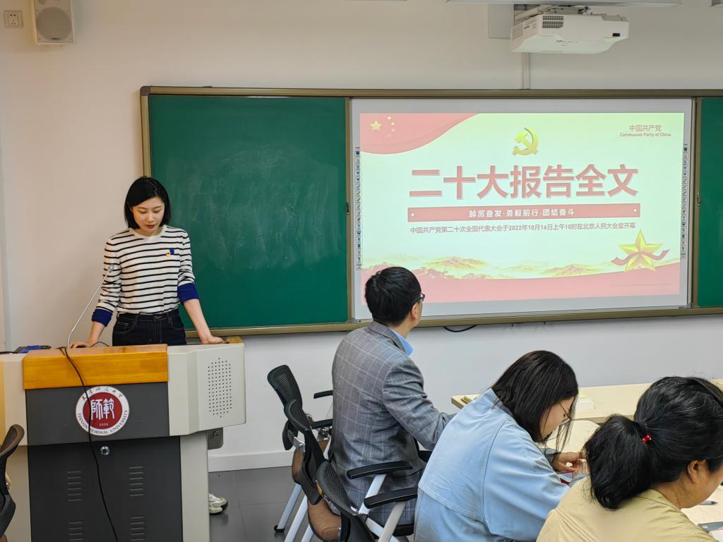 在专题学习交流研讨过程中,支部坚持把持续深化原文学习党的二十大报告作为主题教育的重要抓手,按照“学一章,懂一章”的初衷,结合主题教育要求,支部进行了“原原本本、逐字逐句学习党的二十大报告”系列学习之二,由支部教师领学了“过去五年的工作和新时代十年的伟大变革”章节并结合当前时政热点分享了学习体会。