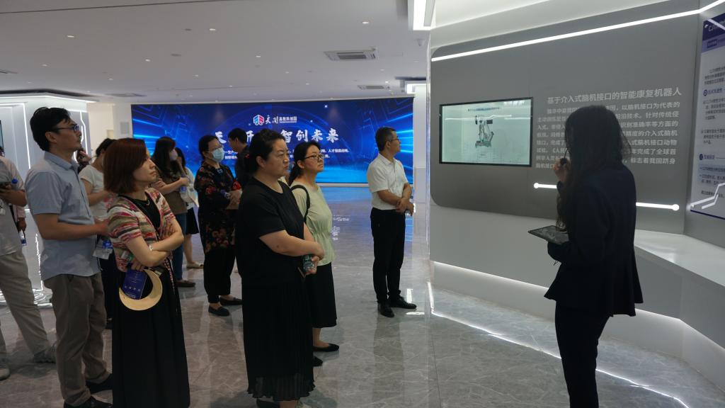 活动首先参观了天开园展厅,在讲解员的引导下,了解了天开园“一核两翼”的总体布局,2027、2030、2035发展目标,体验了智能微厅、24小时自助体检等智慧项目,并对已经入驻的天津大学和南开大学科研团队的创业项目、产品进行了充分的考察。