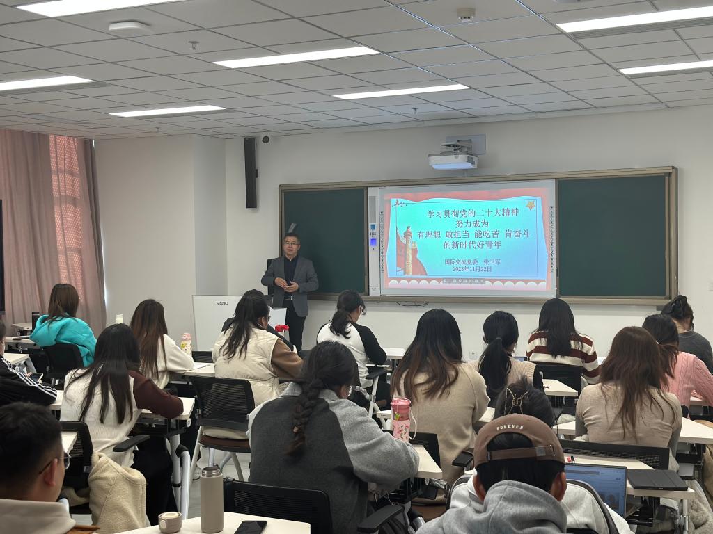 为进一步推进党的二十大精神“往深里走,往实里走”,更好地为新时代有为青年厚植思想理论知识,牢筑理想信念之基,国际交流党委书记张卫军于11月22日在教研楼208室,为2023级入党申请人开展了题为“学习贯彻党的二十大精神,努力成为有理想、敢担当、能吃苦、肯奋斗的新时代好青年”党课学习教育活动。