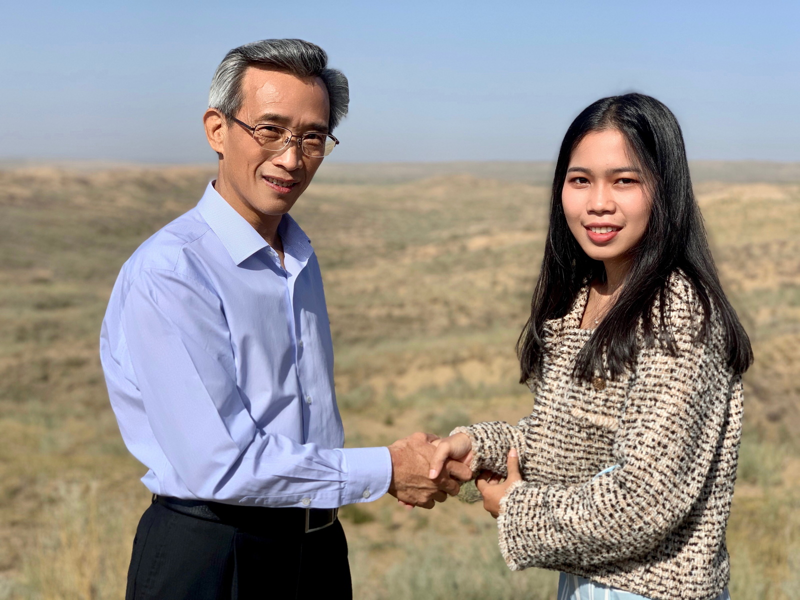2021年9月28日,考察白芨滩国家级自然保护区防沙治沙项目时,中国人民对外友好协会会长林松添与李诗涵合影