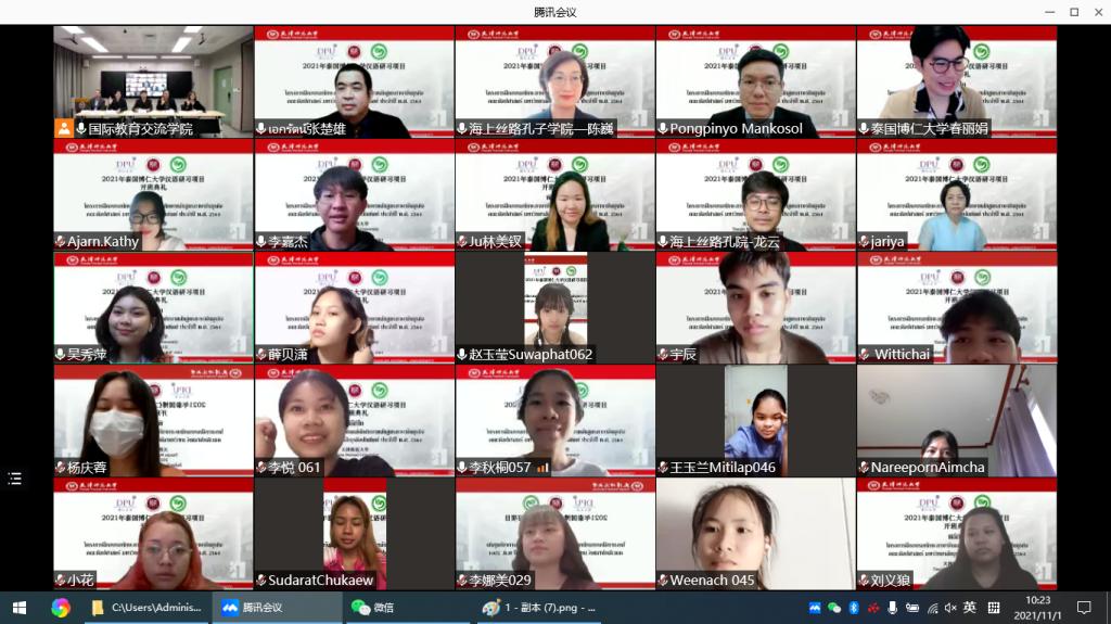 11月1日,2021年泰国博仁大学汉语研习项目开班典礼在线上举行。泰国海上丝路孔子公司外方经理张楚雄、中方经理陈巍,泰国博仁大学人文公司经理彭斌优·曼歌松、经贸中文系主任林美钗,公司职工管理服务中心主任潘红岩、雷竞技raybet经理赵雅文,以及泰国博仁大学、公司国际交流处、雷竞技raybet相关教师和153名汉语研习项目成员参加典礼。