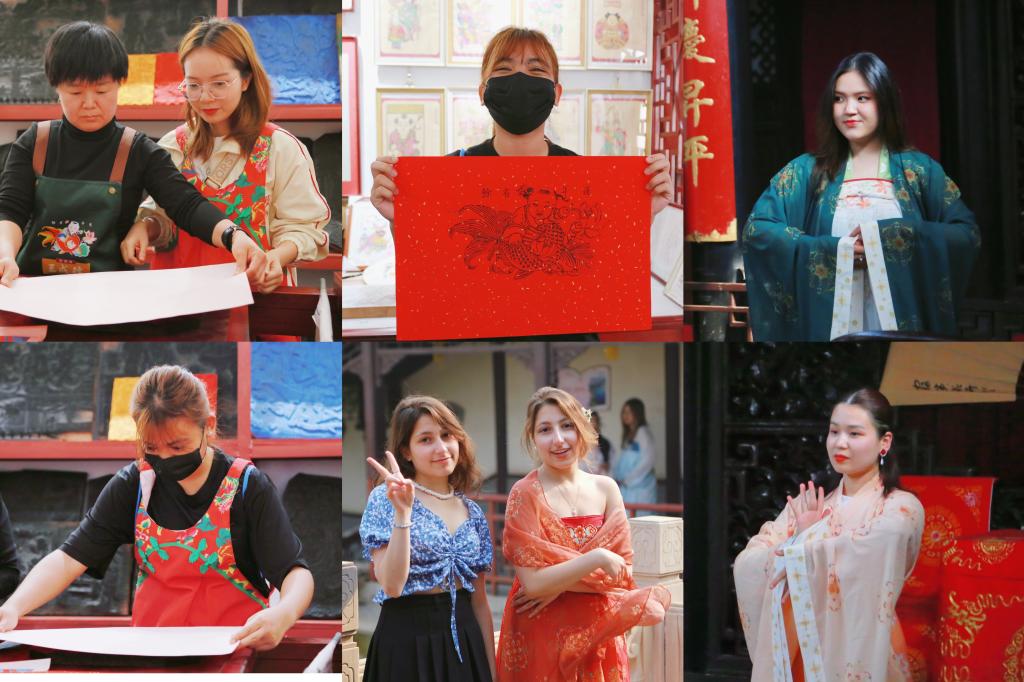 春和景明,春风拂面。活动当天,国际员工着汉服赴杨柳青民俗博物馆、石家大院、安家大院、玉成号年画坊参观,在参观过程中,同学们对杨柳青民俗 以及石家大院的历史有了进一步的了解。参观结束后,同学们来到玉成号年画坊进行拓印体验,跟随年画坊的师傅学习年画制作。