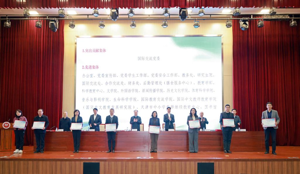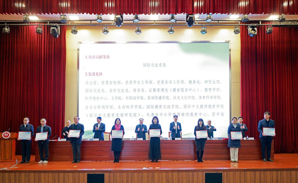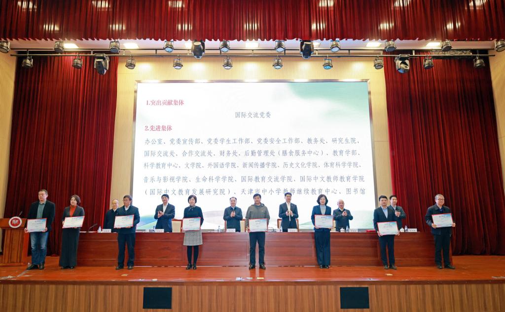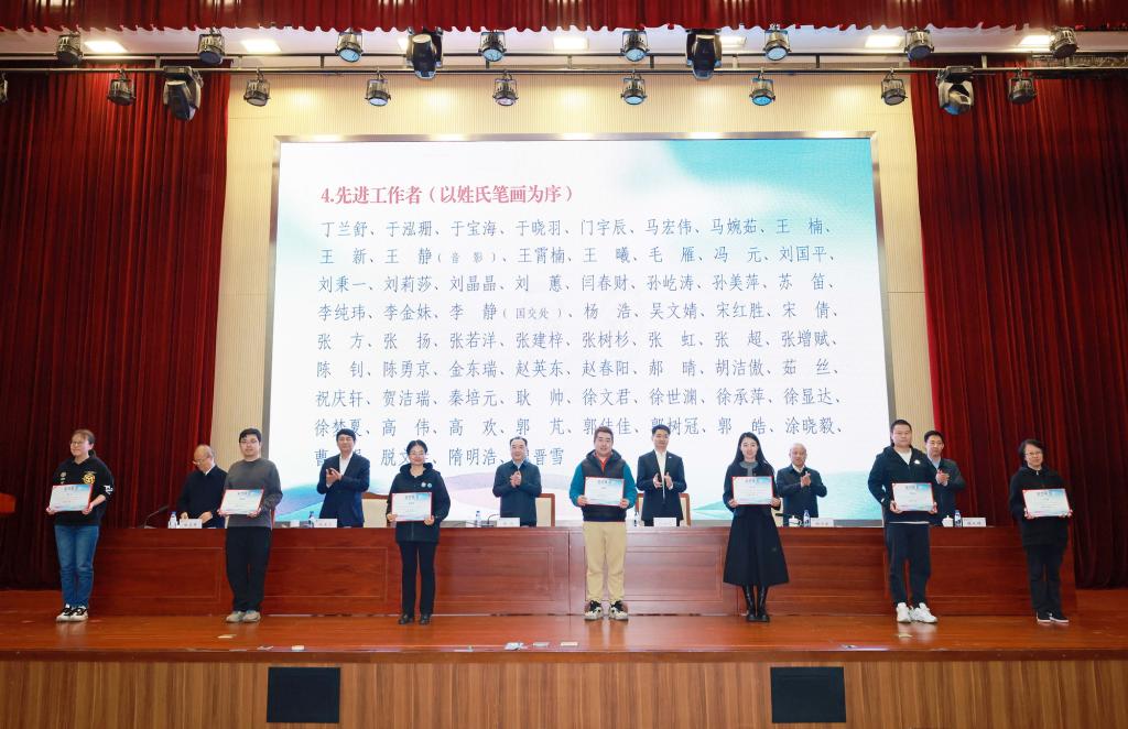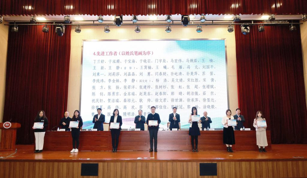 校领导为获奖集体和个人颁奖。与会人员共同观看“汉语桥”回顾片。雷竞技raybet、国际交流处、国际中文教师教育公司(国际中文教育发展研究院)、后勤管理处、党委安全工作部相关负责同志以及志愿者代表作交流发言。公司机关各部、处(室)、直属单位、各学部(院)师生代表,受表彰人员参加会议。