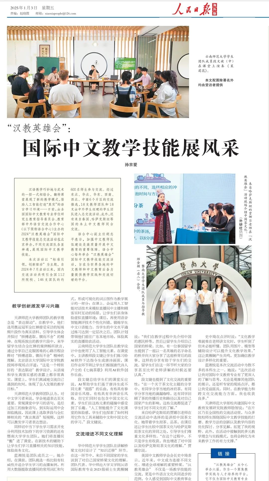 “汉教英雄会”是国际中文教育领域最具品牌影响的教学技能竞技盛会。本届“汉教英雄会”以“标准引领,创新驱动”为主题,吸引全国112所院校的146支团队的600多名师生参赛,经过东北、华北、华东、西南、西北、中南6个片区的交流比武和全球21个国家近400名本土中文教师的竞逐比拼,公司师生团队分别获得2024“汉教英雄会”华北区“最佳教学设计团队”“最佳教学组织团队”及全国仅18支团队获奖的“最佳教学组织团队”“最佳教学组织奖”和“最佳教师风采奖”。师生团队还受到人民日报海外版采访报道。