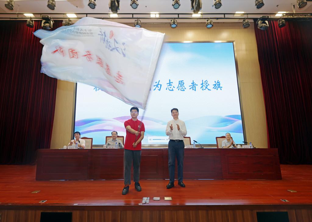 巩金龙向“汉语桥”志愿服务团队代表授旗。