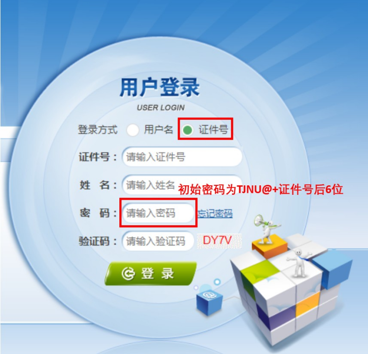 首次登录平台请选择证件号登录,“证件号”一栏内填入居民身份证号,“姓名”一栏填入本人姓名、“密码”一栏填入初始密码(初始密码为TJNU@+证件号后6位,比如证件号后6位为:123456,初始密码为:TJNU@123456)。非首次登录缴费平台,则按照本人修改后的密码进行登录。