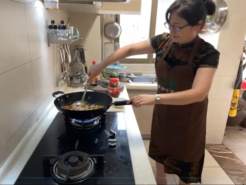 随后,她向英国同学们介绍了中国传统服饰旗袍和汉服的形制和文化寓意,展示了中国服饰的精湛工艺和端庄儒雅之美;她的父亲使用手摇石磨现场磨制豆腐,让同学们通过这一制作过程深刻体会到中国古人的勤劳和智慧;母亲亲自下厨烹饪了当地的经典名菜——麻婆豆腐,香麻辣味充盈味蕾的感觉透过屏幕相信能让每一位同学体验到重庆饮食文化的独特魅力。