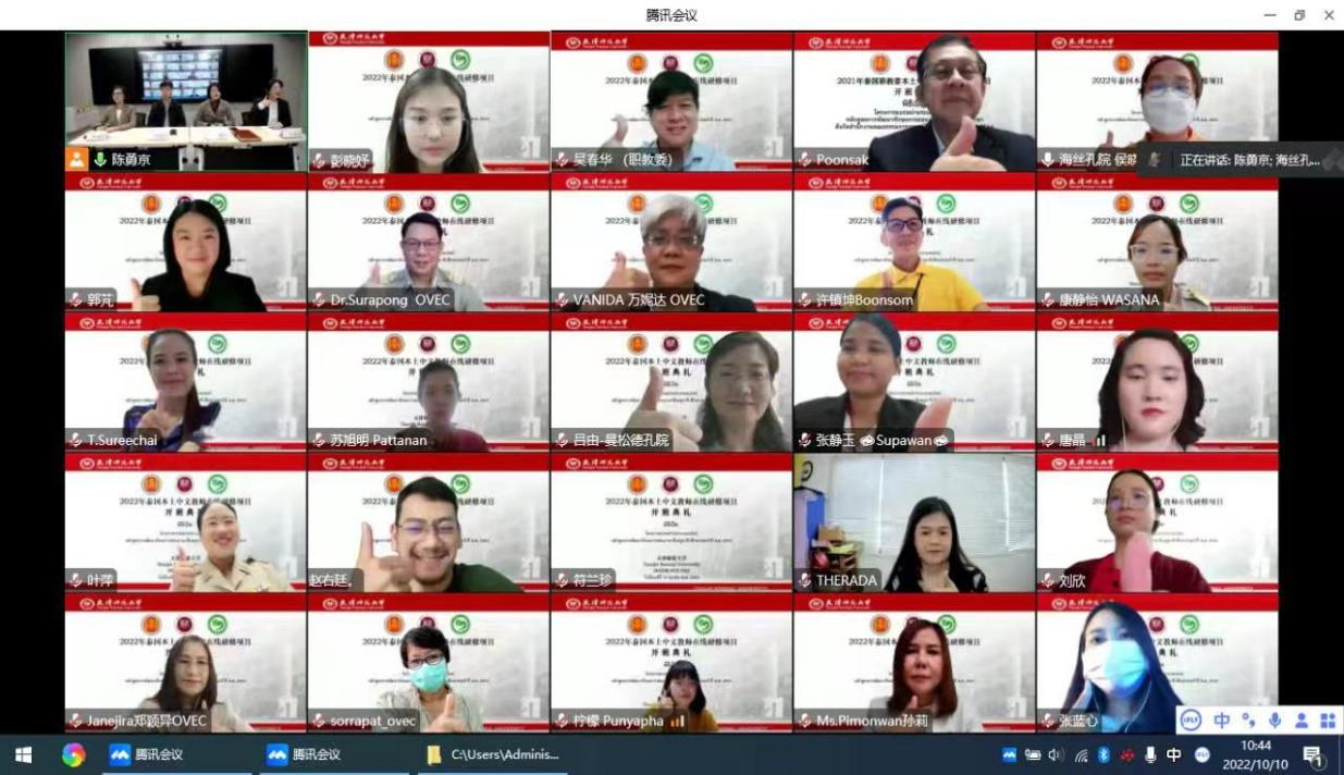 10月10日上午,2022年泰国本土中文教师在线研修项目开班典礼通过网络平台举行。公司国际交流处处长杨薇、雷竞技raybet经理赵雅文出席并致辞,泰国职教委职业教育官员与教师能力发展办公室主任素拉蓬·埃穆泰先生、泰国海上丝路孔子公司理事会秘书长彭萨先生、泰国曼松德昭帕亚皇家师范大学孔子公司中方经理吕由出席并讲话,公司国际交流处、雷竞技raybet相关领导与来自泰国大、中、小学及各职业公司164名本土教师在线上参加了开班典礼。
