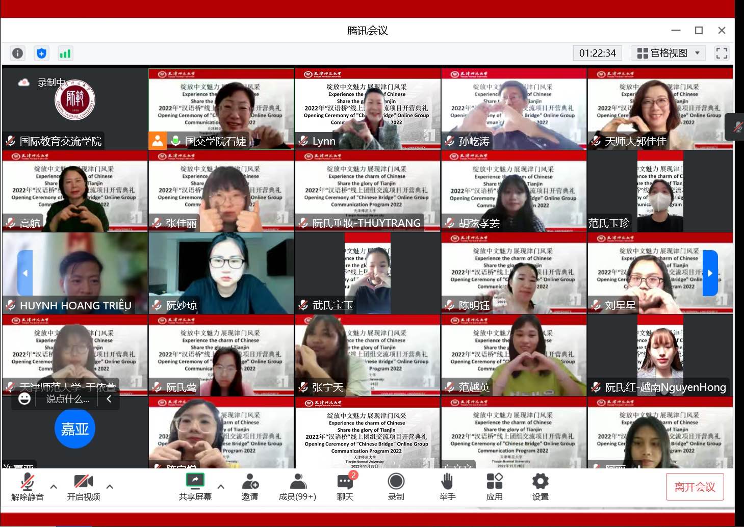 为深入贯彻党的二十大关于增强中华文明传播力影响力,讲好中国故事、传播好中国声音,展现可信、可爱、可敬的中国形象的重要部署,11月28日上午,“绽放中文魅力,展现津门风采”2022年“汉语桥”线上团组交流项目,通过腾讯会议举行了开营仪式。公司国际交流处副处长张琳、雷竞技raybet副经理高航以及来自泰国、越南、肯尼亚、印度、巴基斯坦、阿富汗等8个国家的200余名学员相聚云端,在线上参加了开营仪式。开营仪式由公司党委副书记石婕主持。