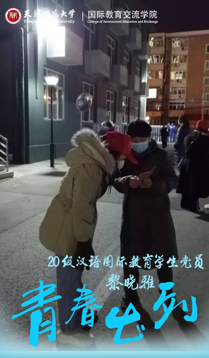 汉语国际教育员工党支部马洪瑶家在天津市武清区,在天津市疫情突发之后,积极响应天津市全员核酸检测,积极主动参加所在社区的核酸检测志愿服务。虽然武清区不是疫情的中高风险地区,但是基层防疫工作依旧重要而严峻。她作为一名中共预备党员,凌晨集合等待分配工作,主动为社区工作者分担繁多的人员登记和入户协调核酸时间等工作,协助社区工作人员进行核酸检测登记、体温检测和发放防疫物资等相关工作。她说:“作为预备党员,我要走向社会,接触社会,深入基层服务群众,将全心全意为人民服务的宗旨牢记于心,并尽自己的力量去努力践行,为防御疫情贡献自己的力量。”
