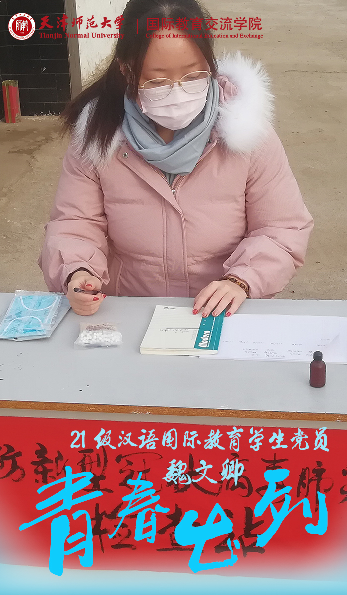 汉语国际教育员工党支部魏文卿老家在山东省济南市莱芜区青沙沟村,她在看到村支部组织疫情防控工作后,积极响应号召,主动报名参加村里疫情防控志愿服务,协助村支部工作人员统计省外返鲁人员,并提醒返乡村民做核酸检测。通过志愿服务,她深刻体会到在基层工作的不易。她说:“面对疫情,作为员工党员,就应迎难而上,要有责任与担当,坚定自己的信念,树立正确的意识形态,将自己所学付诸于行动,与病毒作斗争,在这场防疫战中贡献出自己的一份力量,用行动发挥党员的先锋模范作用。”