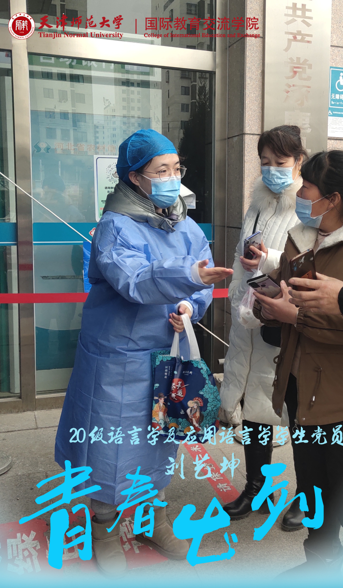 汉语国际教育党支部侯康艳在河北省廊坊市三河市燕郊高新区中燕小区从事志愿者服务工作。在社区内部和其他志愿者一起有序开展卡点测温,信息登记,询问摸排,政策宣传等工作,为社区防控工作贡献了青春力量,切实在疫情防控中发挥党员的先锋模范作用,她说:“党员就是排头兵,我唯一能做的就是坚守自己的工作,严守疫情防控关卡,严防疫情扩散,为全国疫情好转献出一份薄力。”